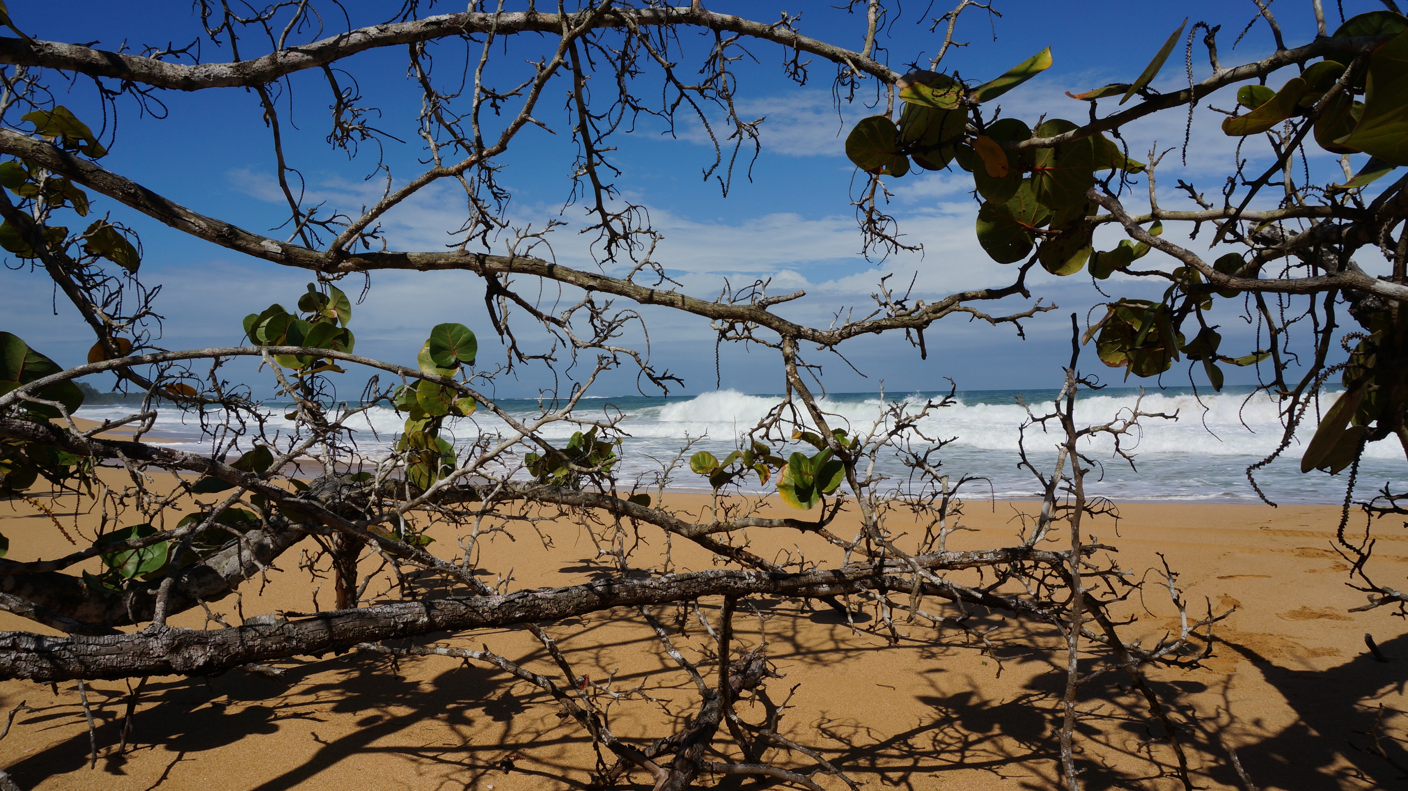 The first day at Bluff beach we picnicked on the most incredibly smooth, clay like sand. It was the color of sawdust and you could not find a rock or a shell for miles. There were also huge trees leaning over the sand providing cool shade, perfect for our picnic. This beach was on the eastern side of the island, and the surf was huge. Waves were crashing, one after the next, creating long tunnels that crashed with 40 foot spray. The currents were clearly going in all different directions so this was not an ideal surfing spot and certainly not safe for swimming. We enjoyed our own private stretch of beach and then the next day indulged in a beer from a little thatched roof bar-hut a little ways south from our private spot.