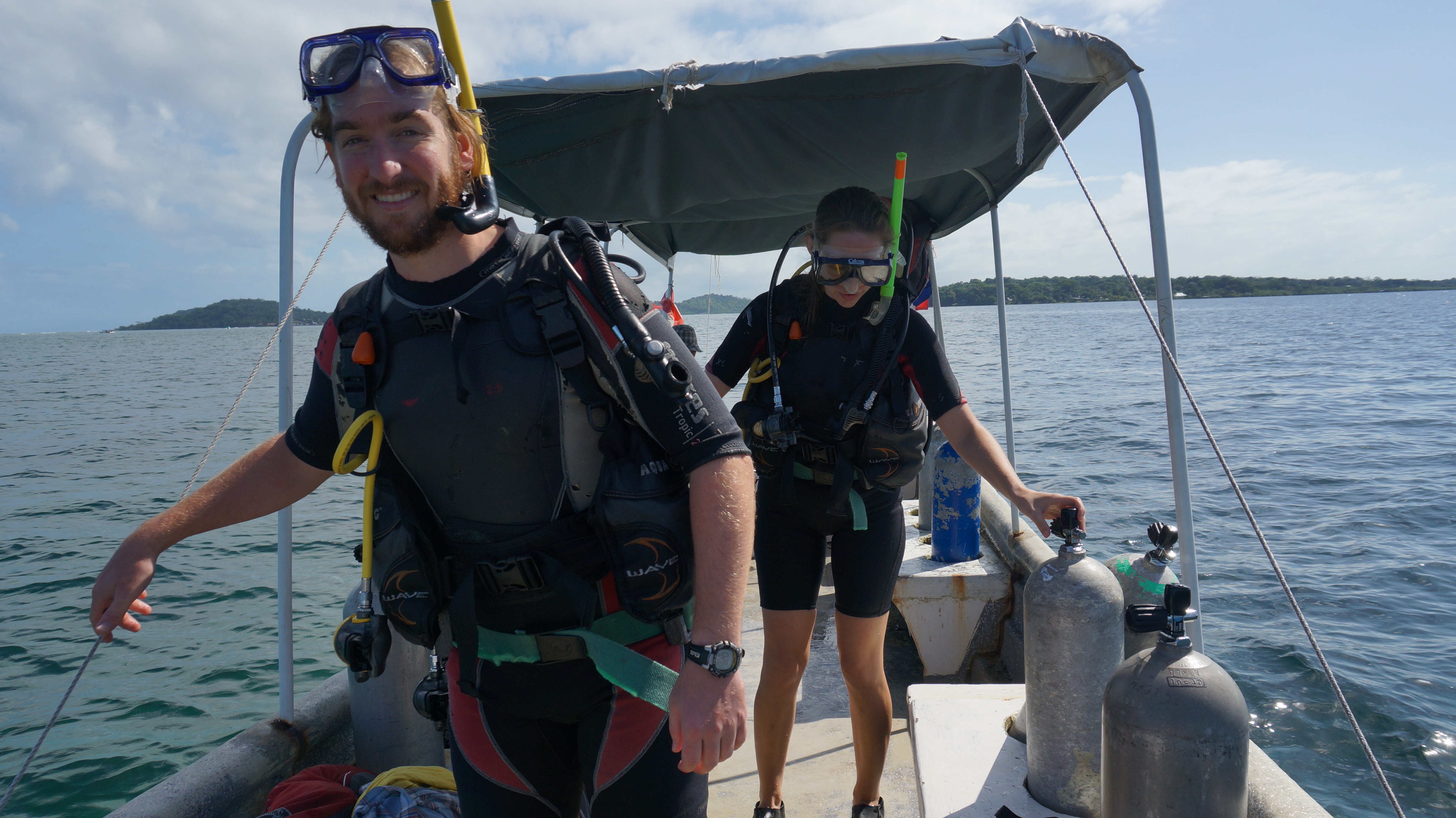 We went for a three day certification course which included 2 confined dives and 4 open water dives at a place called La Buga. Our instructor Leo was a laid back and patient Panamanian guy who always gave us a fist bump and a surfers wave underwater if we completed a test correctly. The two ‘confined water’ dives actually just took place right in the ocean but just off of the docks. The scuba regulators, which you put in your mouth to breathe from, supply a steady and reassuring flow of air. That reassurance, along with the high quality goggles allowed me to stay relatively calm. We had to learn how to set up and test our equipment, and then we had to be able to perform many tests under water such as swimming without our goggles and controlling our buoyancy. The open water dives were each about 45 minutes long. I wavered between controlled panic and intrigued curiosity.