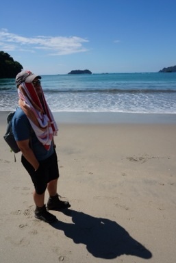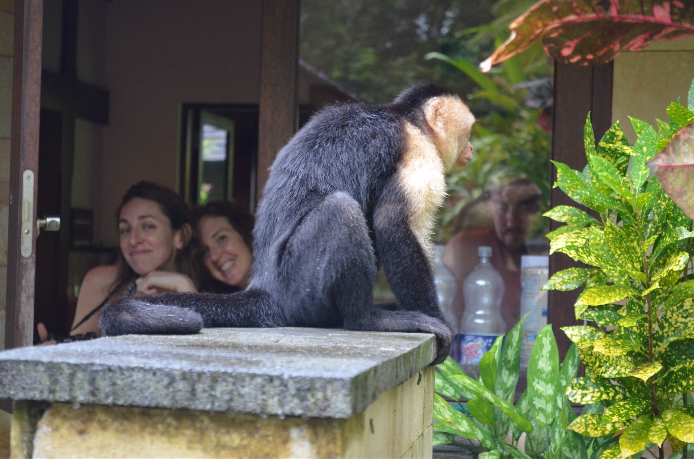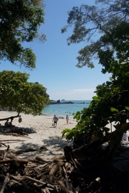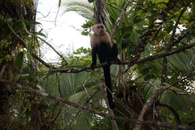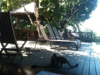 ‘Casa de Bali,’ is a home that was constructed in Bali and then moved here to Costa Rica. It is made of Balinese wood that had been cured for 50 years and designed to be enjoyed with the open air as opposed to AC. The house was perched on a hill in the middle of the jungle trees which sloped down towards the ocean, which you could see clearly from the infinity pool out back. I’m talking about some MTV cribs quality digs here. Each couple had their own quarters, replete with marble surfaces and copper bathtubs. Jordan and I knew that we had better enjoy this as the quality and luxuriousness of our housing after the family vacation ended would be miles away from this. The first day at Casa Bali we all went for a guided tour of Manuel Antonio National Park. The park is beautiful and we saw a sloth, capuchin and howler monkeys as well as several interested plants and colorful iguanas. We were all elated by these wildlife sightings. Little did we know, however, that everyday right through our backyard we would see a three toed sloth, toucans, iguanas, white face capuchin monkeys and squirrel monkeys. Both types of monkey travel in groups and one morning both groups arrived together. There were upwards of 20-25 monkeys on our back deck, some of which actually stole bananas from the kitchen, if only those monkeys knew what a cliche they were! how sad. Additionally, we all learned what sound a sloth makes (insert link). Bet you wouldn’t have guessed that, huh? The Pacific Ocean right out our door was warm and inviting. Shocking Jordan and myself, i not only went swimming, but i boogie boarded almost everyday. My lifelong fear of the ocean seemed to be slipping away faster than the tide. Not even the occasional sting of sea lice (think mosquito of the sea) deterred me. It was wonderful to spend time with Jordan’s family. From the beach to the pool and back, we really lived it up.